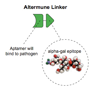 Altermune has a shot at it.Give its antibodies, its workhorse molecules, bionic arms, little chemical extensions that allow an old antibody to do new tricks. Altermune, LLC, in collaboration with Ron Cook of Biosearch in Novato, CA, re-directed antibodies whose job used to be binding to something called the alpha-Gal epitope or galactose-alpha-1,3-galactosyl-beta-1,4-N-acetyl glucosamine, to influenza using DNA aptamers attached to the alpha-Gal epitope. These linkers can tightly seize an influenza virion, and turn it over to a hungry human macrophage. The change was accomplished with a drug which can be inhaled. The virus never saw it coming.